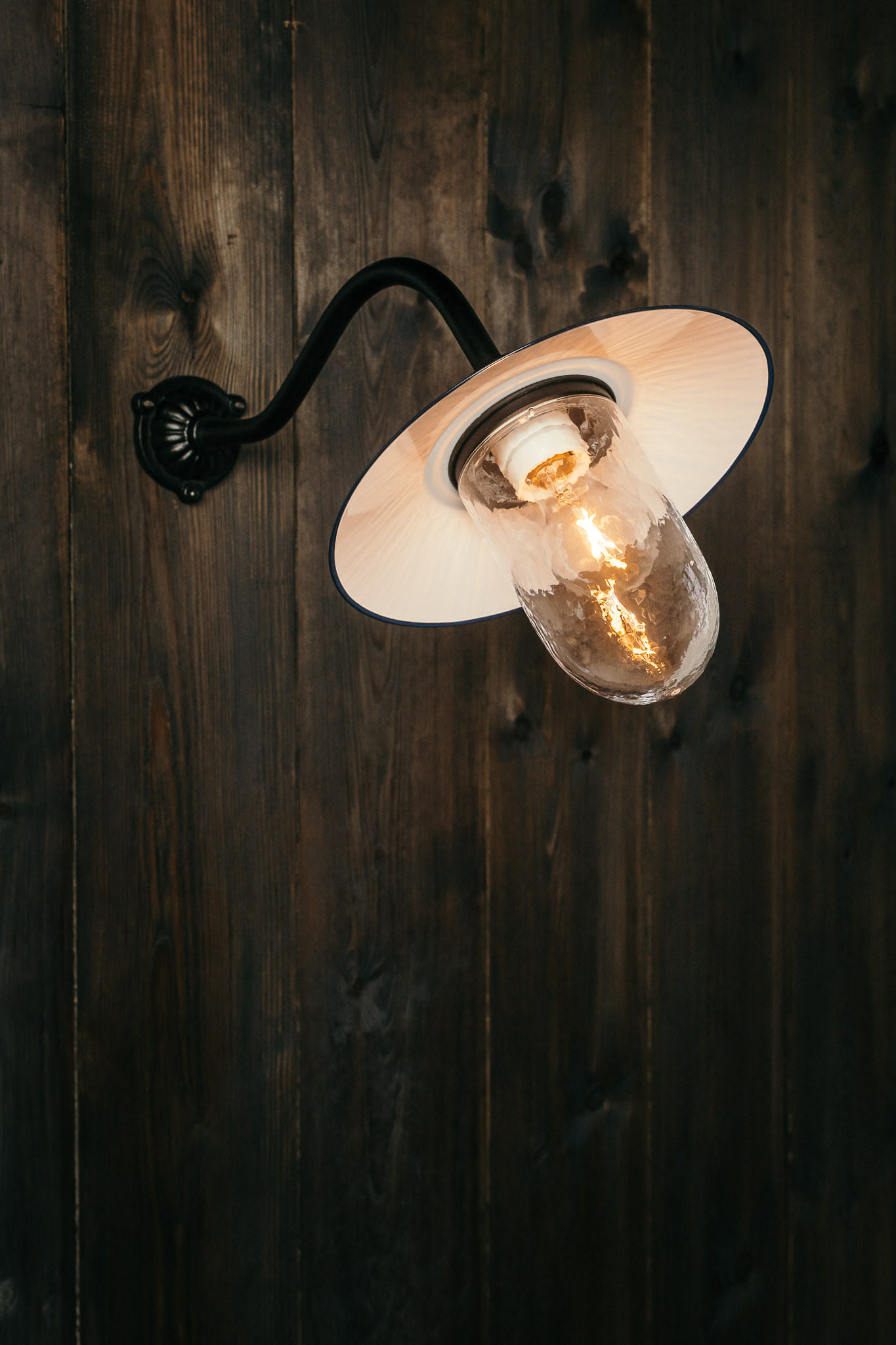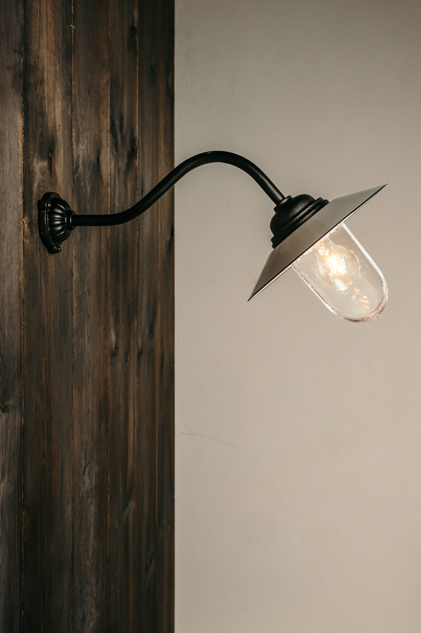 Very solid handmade period outdoor lamp from the early 1900s. Common model throughout the country and in Europe. Also called stable lamp or stable lantern even though it was originally mounted on the main buildings themselves. Differs from the “Mill Lamp” in that it has no decoration on the lamp arm.