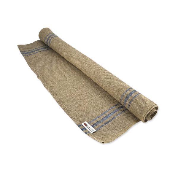 100% oblekt lin.. Vävd i traditionell skyttelvävstol, därav de starka stadkanterna. Linblå rutning. Kypertvävd med stort gåsögemönster.
