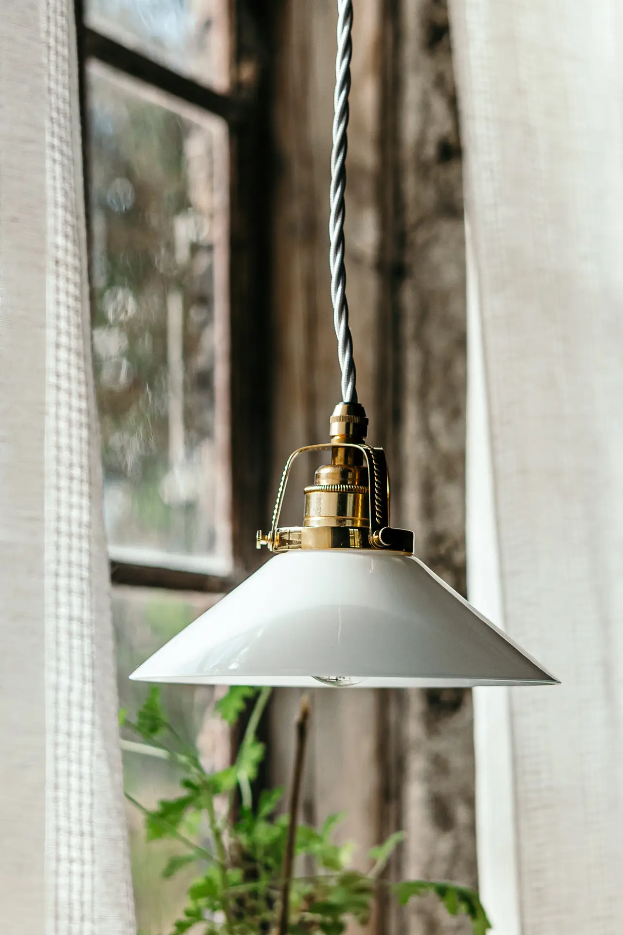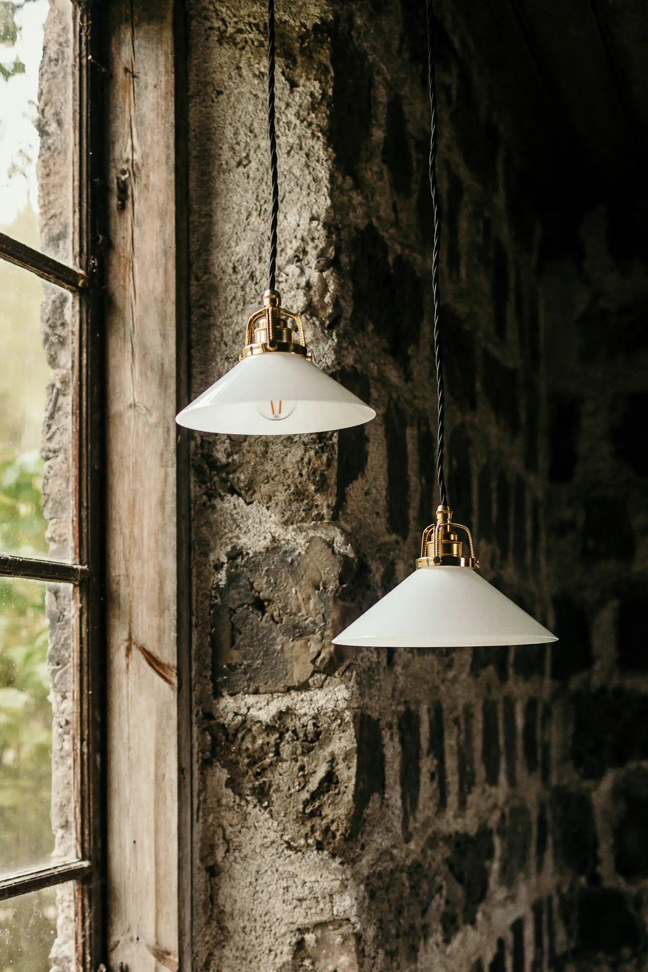 Hand-blown opal glass shade, diameter 20 cm. Lamp holder in untreated brass with ceramic base for E27. Twisted three-core (grounded) textile cord 2 m, black, included.