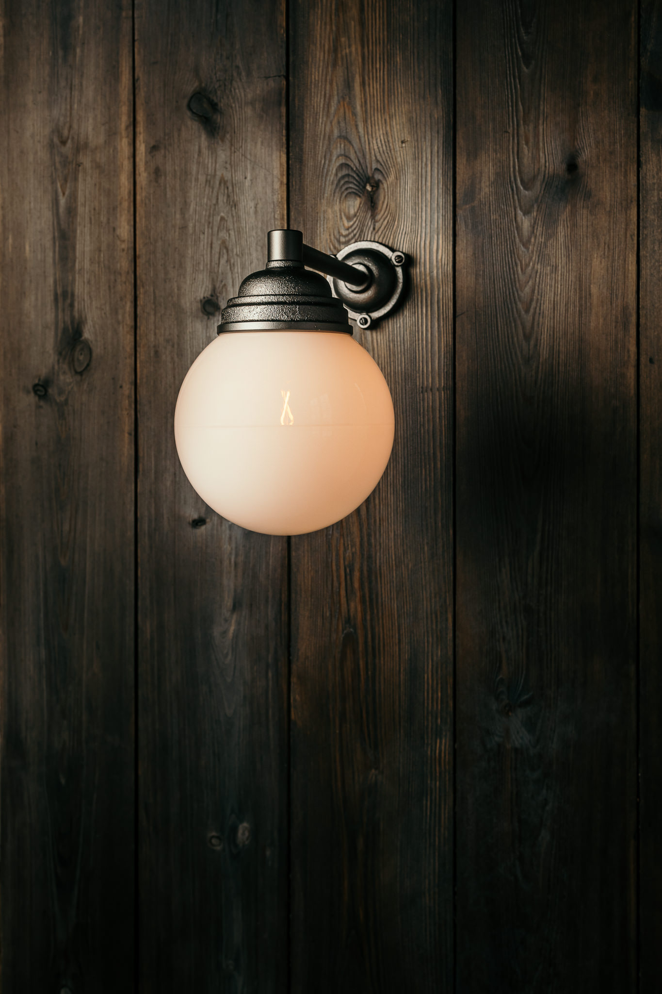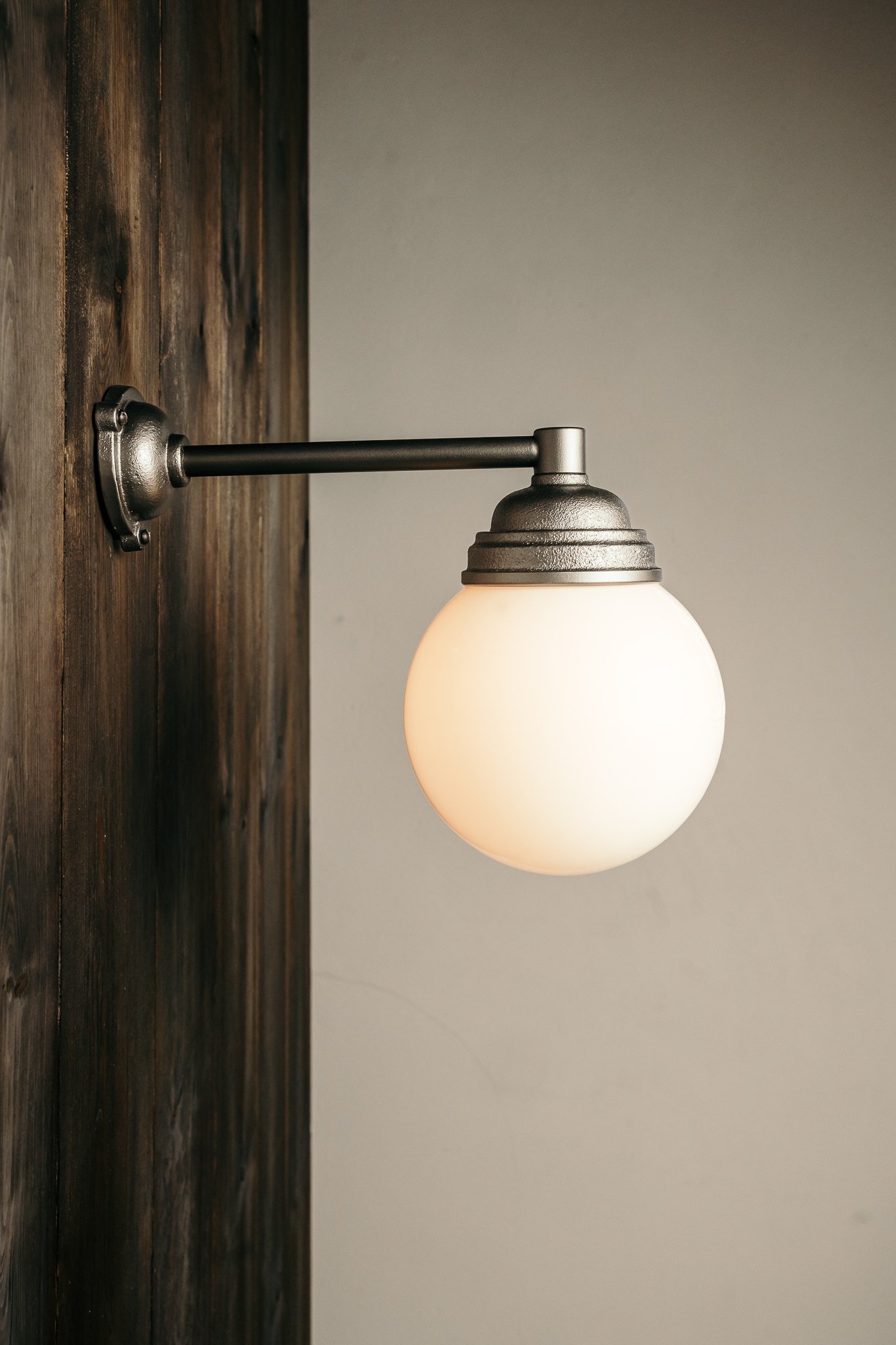 Sandgjutet väggfäste och gjutjärnsarm, målade med rostskydd i en grafitgrå kulör. Glob av vitt opalglas. Väggfästets diameter 8 cm. Längd 34 cm, höjd 28 cm. Vikt 3,35 kg. IP 44. Sockel E27. Träskruv medföljer.