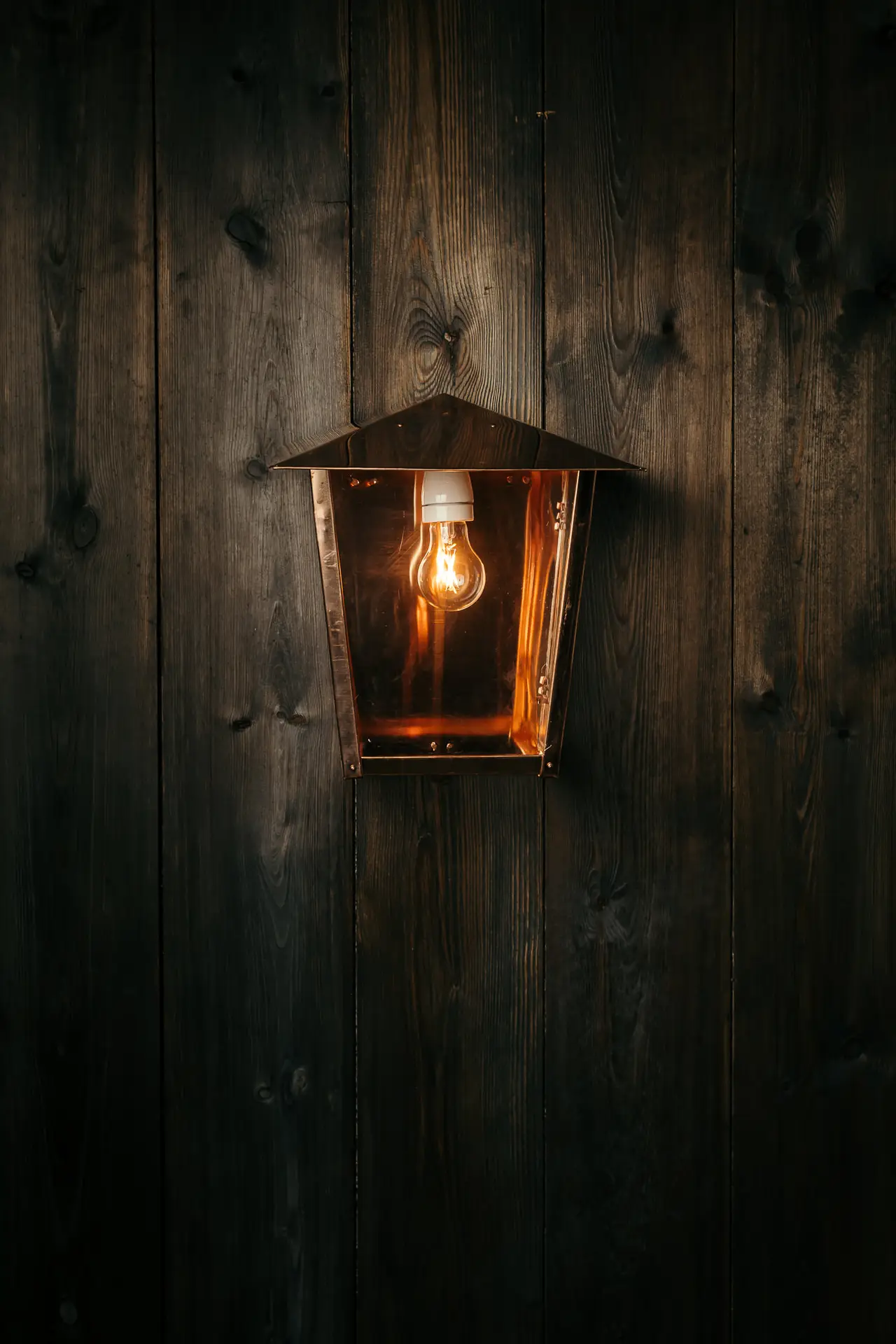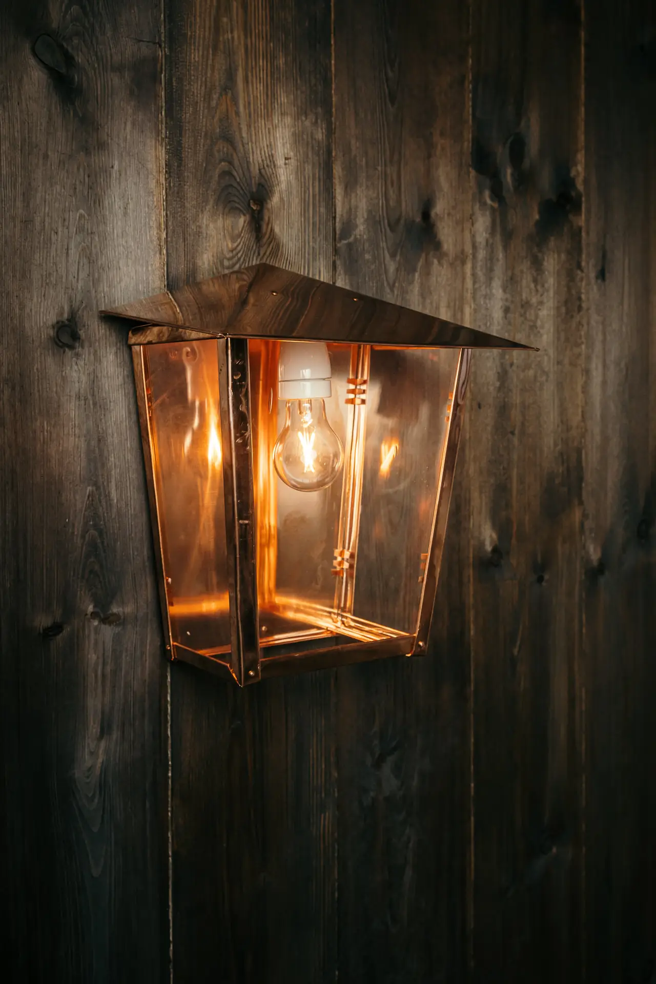 Vägglykta kopparplåt är en utomhuslampa av koppar i en klassisk lyktform. Modellen passar utmärkt för lantliga hus och gårdar, sekelskifteshus, villor i herrgårdsstil, röda stugor med vita knutar och klassiska trähus. Glaset är munblåst, 3 mm tjockt. Botten och bakstycket är i kopparplåt, vilket gör det lätt att byta glödlampa.